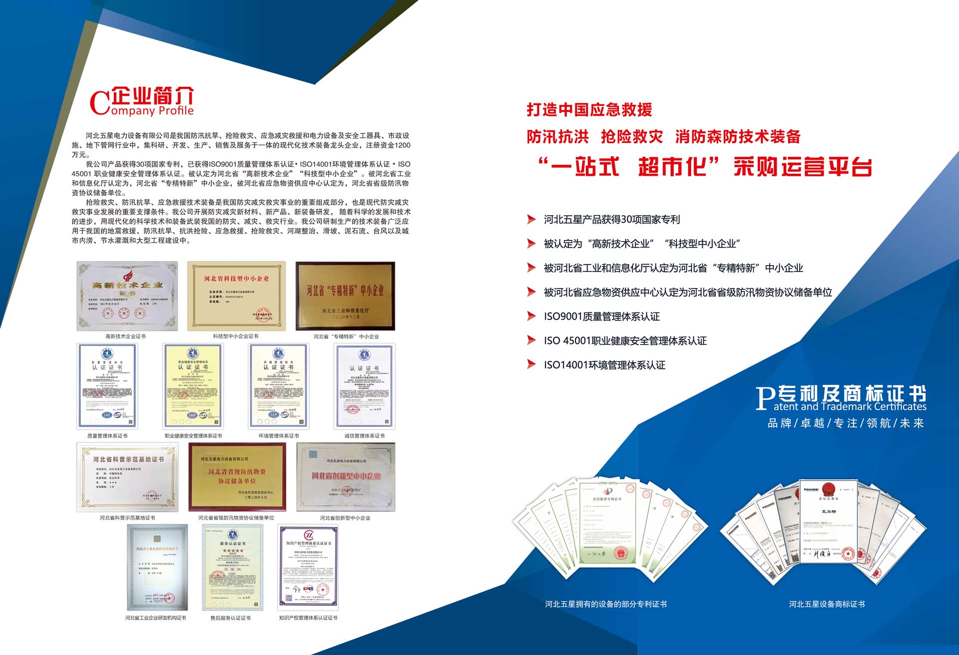 河北五星電力設備有限公司是我國防汛抗旱、搶險救災、應急減災救援和電力設備及安全工器具、市政設施、地下管網行業中,集科研、開發、生產、銷售及服務于一體的現代化技術裝備高新技術企業,注冊資金1200萬元。  我公司產品已獲得ISO9001質量管理體系...